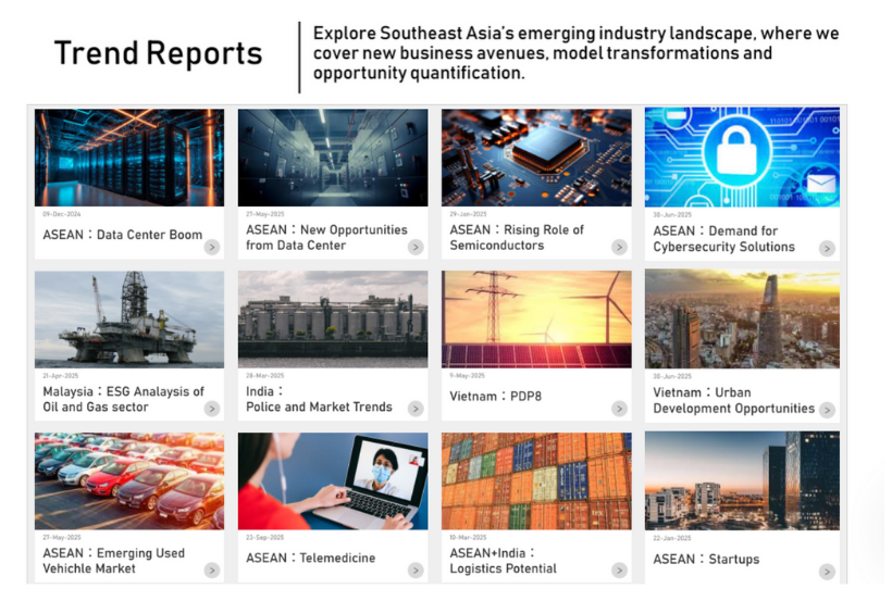 Unlike standardised templates, these insight reports adapt their structure and scope depending on the topic. They’re particularly valuable for executives and consultants navigating new terrain in SEA markets — offering both breadth and regional nuance.